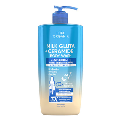 Indulge in the luxurious care of Luxe Organix Milk Gluta + Ceramide Body Wash, which pampers your skin with its soothing and nourishing effects. This gentle brightening serum-body wash is enriched with Glutathione and Ceramide, intensely nourishing and brightening the skin for a more even skin tone. With Milk Protein, Hyaluronic acid, and Panthenol, it repairs, calms, and leaves your skin beautifully radiant. Its 24-hour intense nourishment will leave your skin soft and healthy-looking. Say goodbye to dryness and irritation with this serum-body wash that maintains your skin's natural moisture balance.